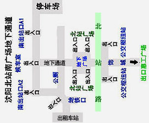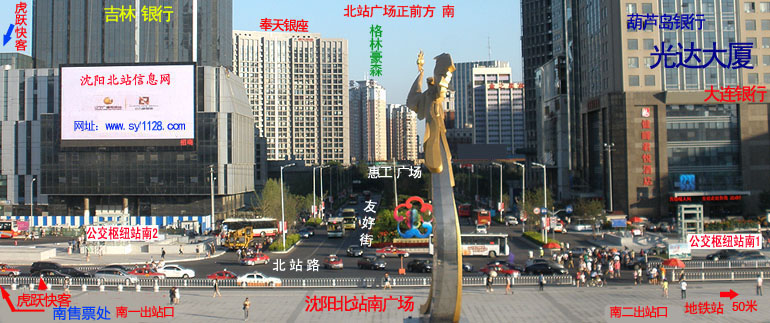 | 南出站口在沈阳北站的正面,也是南面,正前方是沈阳金融商贸开发区(沈河区),西行300米就是和平区.青年大街就是沈阳金廊.北站广场雕塑所指的方向是南,北站正前方是友好街.惠工广场,东面是瑞心东方酒店.西面是邮政大厦 。 |
