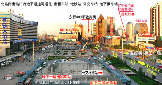 | 沈阳北站位于沈阳的中心.沈阳金融商贸开发区就座落在站前,北站周边分别是(南)沈河区.(西)和平区.(北)皇姑区.(东)大东区交通十分方便。 |